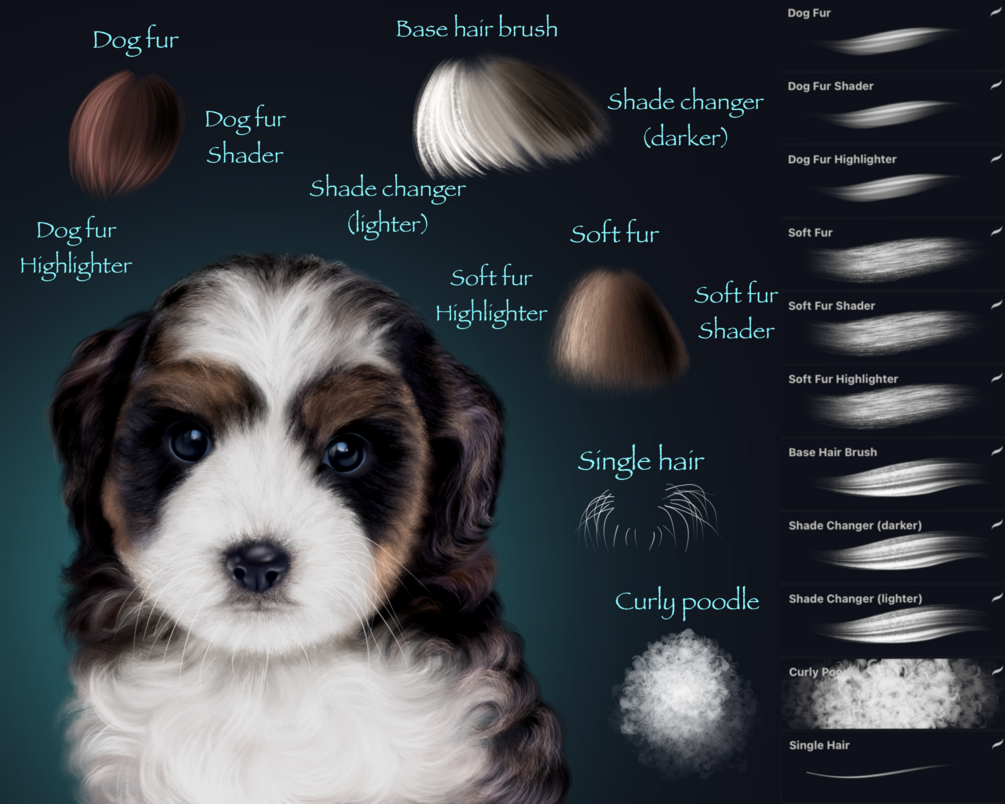 - 3 dog fur brushes (basic, shader, highlighter), they can be used for other animal and human drawings as well